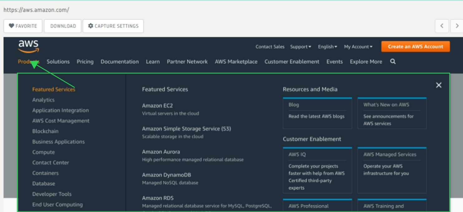 For this example, we are going to hover over the "Products" menu of AWS website so that we can see all their products before taking a screenshot. The arrow in the picture below shows the element that we want to hover over (it can be any element on the page). The webpage before hovering over the "Products" menu looks like this: